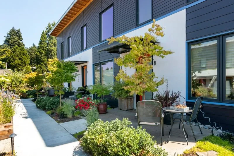 Organized around a community garden, the the Arcadia townhomes anchor a multi-generational community with a strong sense of social connectivity and ecological responsibility.