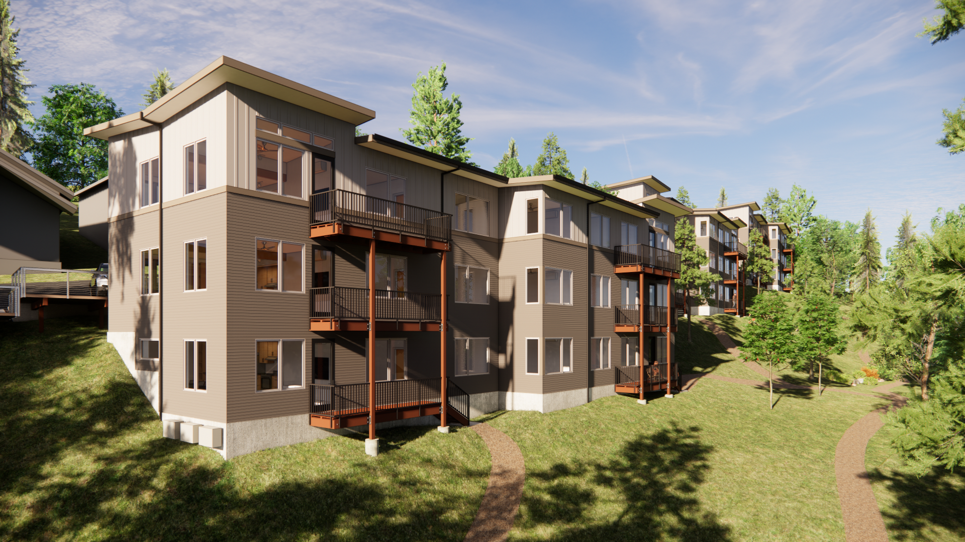Crestline at Colony Oaks includes three buildings with a total of 18 homes on a steep hillside in west Eugene. Every residence faces downhill to a preserved open landscape with large trees. The dramatic siting allows expansive views of the city below. To make the best use of the challenging topography, the complex is split into a series of structures that hug the curves of the road.
