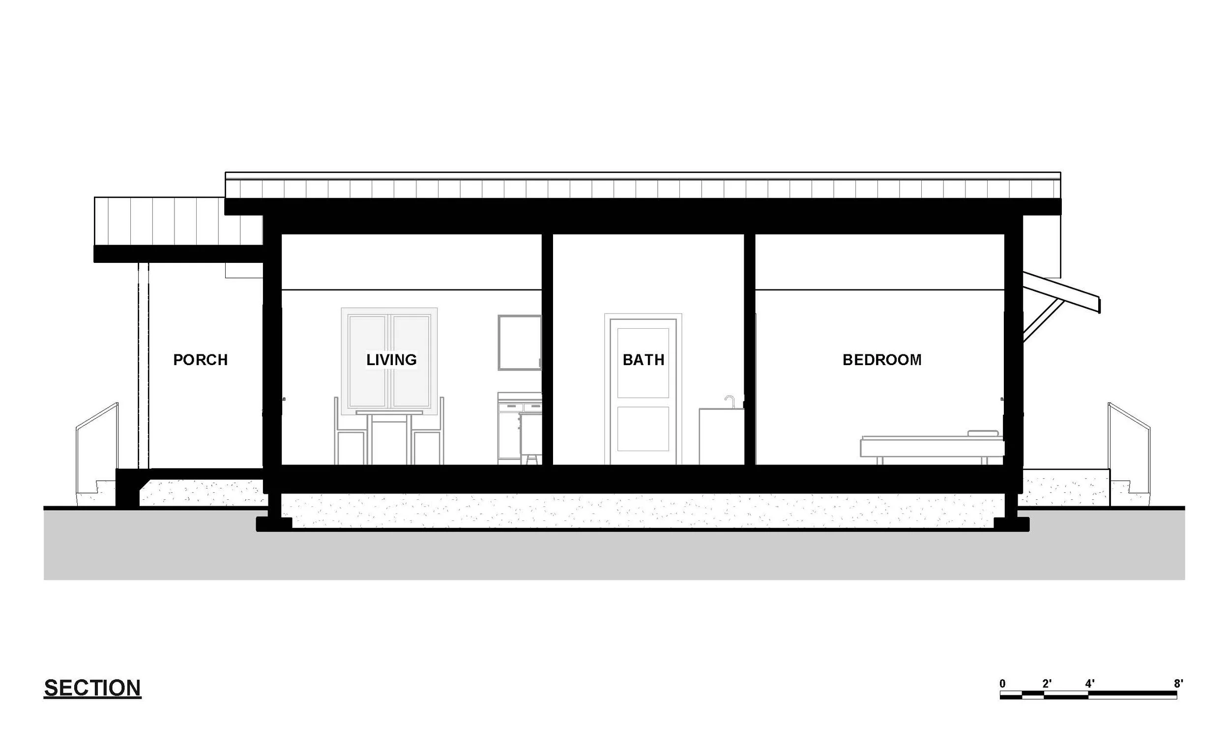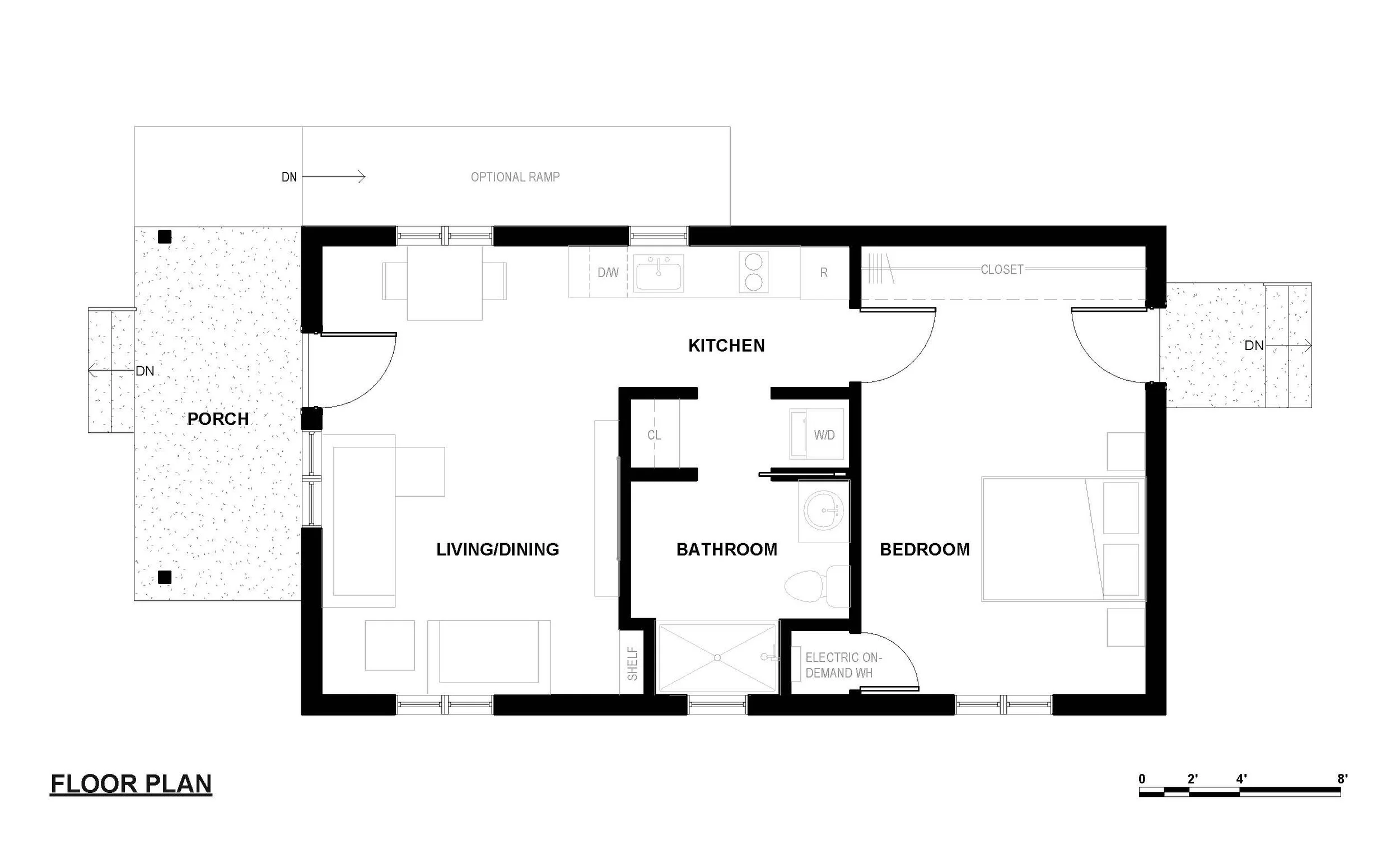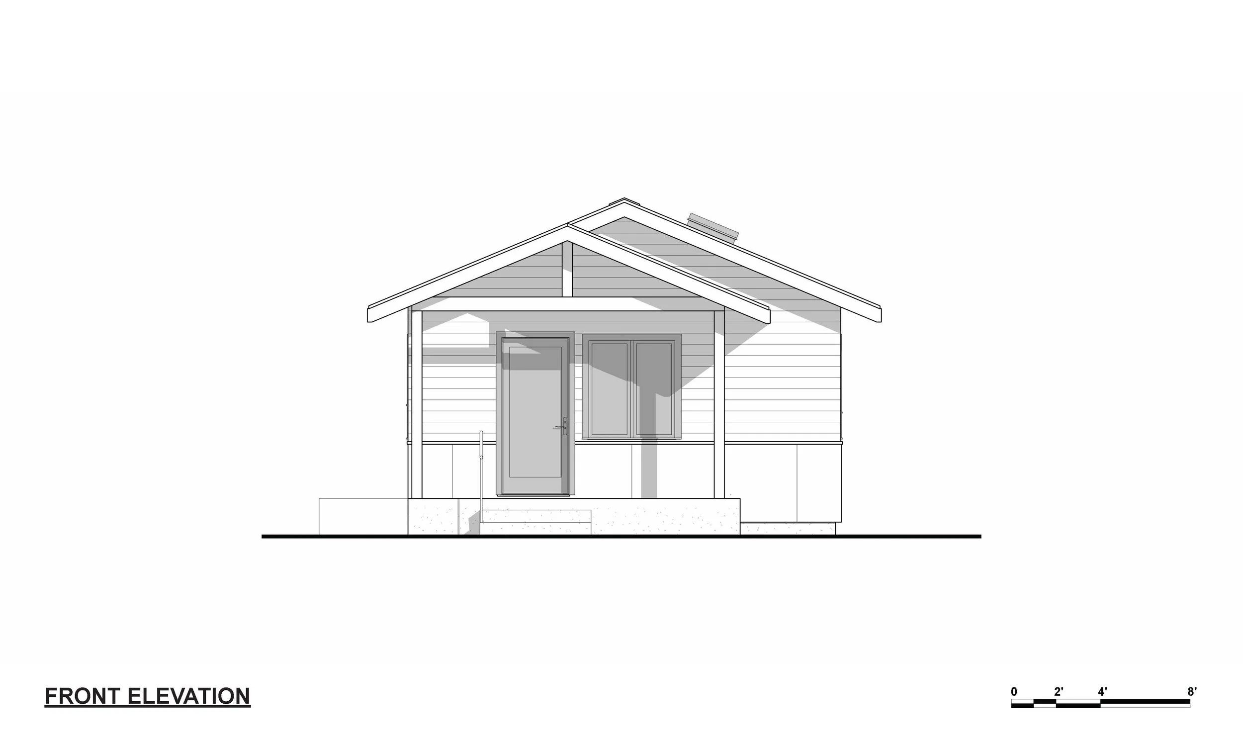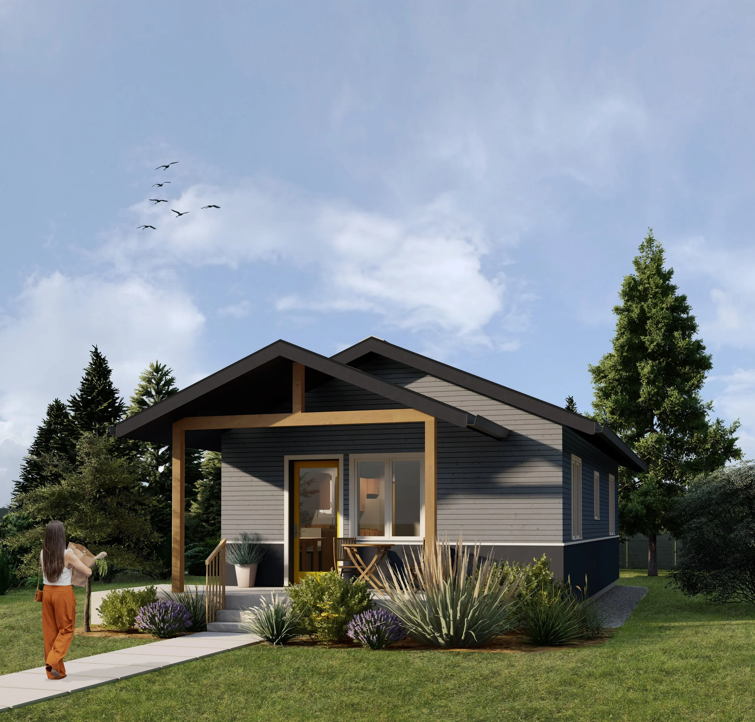 A one-bedroom craftsman style ADU designed with accessibility in mind. The roof is vaulted for an increased feeling of spaciousness in a relatively small footprint. The main entry is shaded by an inviting front porch. A stacking washer and dryer, a compact dishwasher, and on-demand electric water heater complete all the necessary modern amenities. This small but beautiful house features an optional ramp as well as an accessible bathroom to accommodate people of all abilities.
