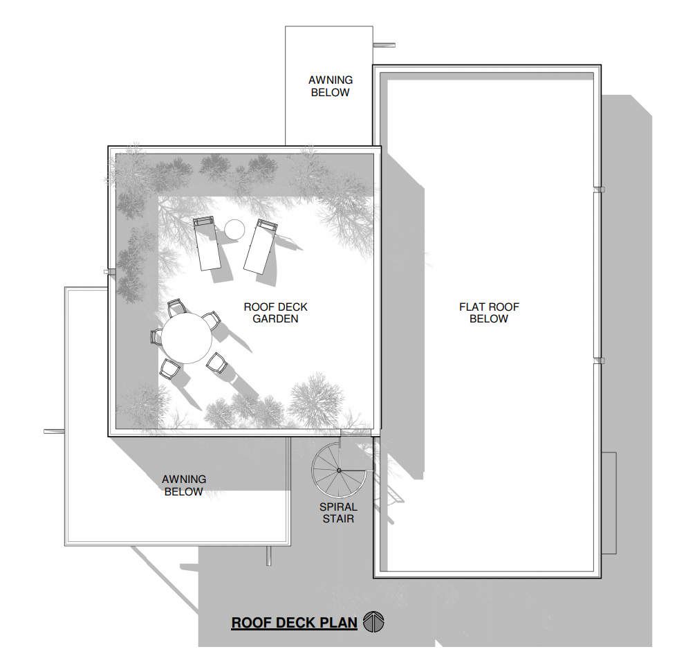 The thin steel awning with a concealed gutter floats on top of seemingly impossible columns and shades a semi-private patio and large open windows from direct sunlight while allowing natural ambient light to occupy the spaces. At the covered patio one can read, cook, relax, and share a meal while enjoying nature. From the patio one is called to the roof deck garden by a bright a beautiful custom spiral stair that exemplifies the playful concept of a space that calls one to another space