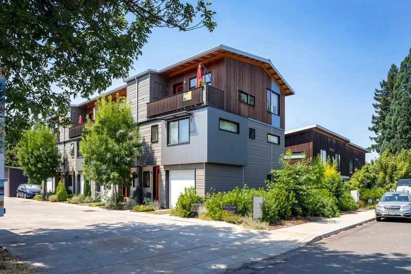 Developed within the heart of a walkable urban neighborhood in Eugene, Oregon, this high-density townhouse community engages with a lively collection of restaurants, food carts, cafes, and a retail shops along the neighborhood’s main street. Comprised of three blocks of multi-story townhouses surrounding a shared internal garden space, the Lucia development encourages direct street level connection to the local community.