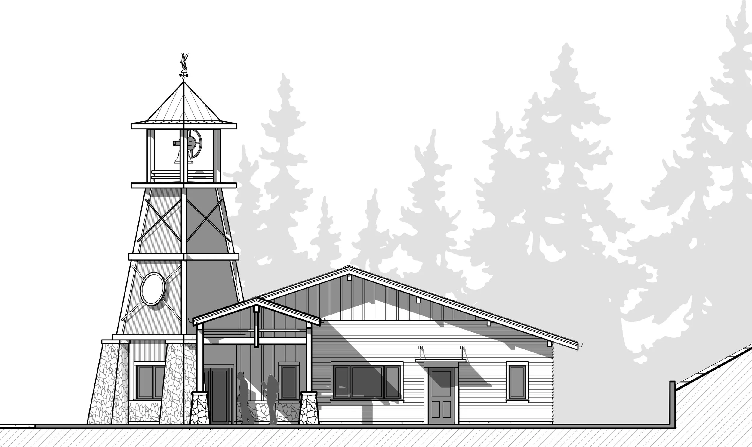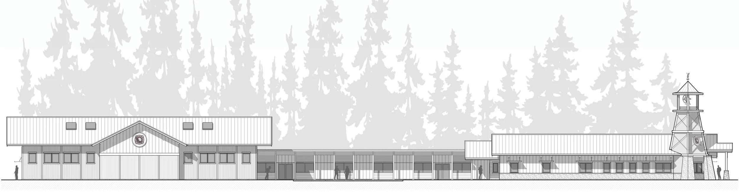The bell tower at the entry evokes the style and construction methods of historic fire watchtowers, using this symbolism to respect the past, while moving forward with continued service to the communities in the future.
